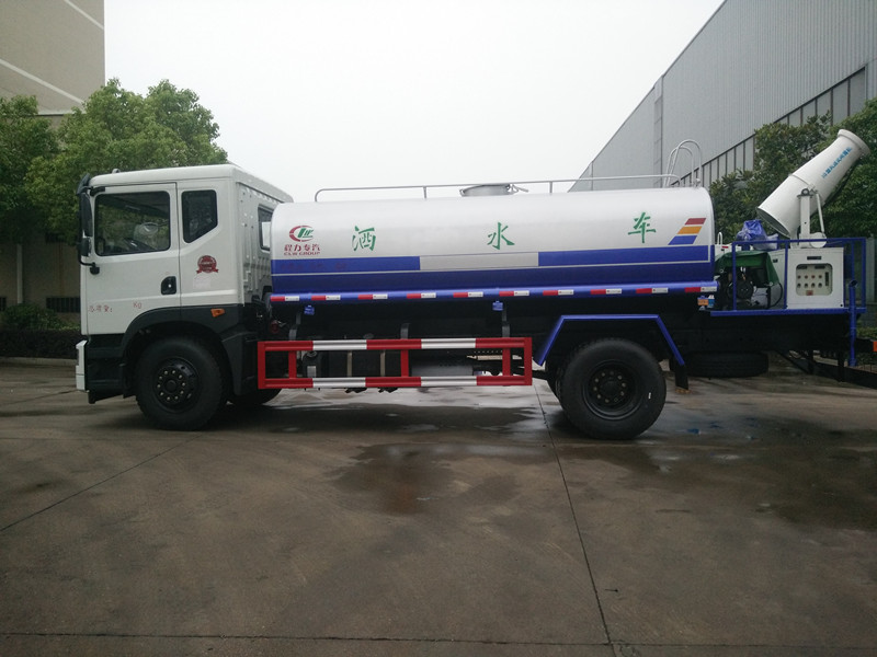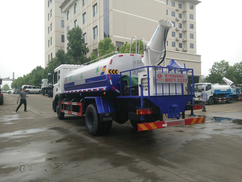 灑水車配置前沖、后灑、左右側(cè)噴水、帶后工作平臺(tái)、平臺(tái)上安裝綠化灑水高炮(炮噴射形狀可調(diào)節(jié):直沖、大雨、中雨毛毛雨、霧狀、可連續(xù)調(diào)節(jié),360°旋轉(zhuǎn)),配消防接口,自流閥,濾網(wǎng),帶專用灑水泵具有自吸自排功能灑水寬度≧14-16米,射程25-30米,帶增壓,方向助力。罐體采用優(yōu)質(zhì)碳鋼制作。帶兩根輸水軟管