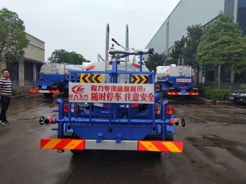 改裝配置:罐體用4MM碳鋼板制作,罐內隔板具有防波作用,以減低汽車行駛時罐體液體的沖擊。整車帶一個專用灑水泵(垂直最大吸程6米),灑水寬度14米,射程28米。多功能灑水車配備2個前沖(噴)(能將路面泥巴、塵土、垃圾沖干凈);2個后灑(能均勻地將水灑在路面,一次灑水寬度14米)、2個側噴(花灑)(能均勻地將路旁綠化帶澆灌)、帶1個后工作平臺,平臺上安裝1個綠化灑水高炮(灑水炮可全方位旋轉,可連續調成直沖狀、大雨、小雨、毛毛雨,霧狀可調節沖洗高大樹木),引水時間<5min,流量90m3/h。帶1個消防接頭,帶1個自流閥,1個過濾裝置、人性化爬梯及側防護欄,安裝灑水音樂喇叭。