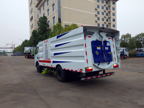 1、東風多利卡國V二類底盤,駕駛室帶前翻,方向助力,7.50R16鋼絲胎,配備玉柴130馬力發動機,低油耗。 2、副發動機采用性能強勁的江鈴77馬力發動機。 3、自動離合器驅動風機,減少風機啟動和停止時對發動機的沖擊。離合器在使用過程中具有高度耐磨、使用壽命長、低噪音、低油耗量和節省成本的優點。 4、采用洛陽上市公司,北玻臺信大功率耐磨免維護離心風機,無噪音,效率高風量大,使用壽命長。 5、清水箱充分利用了車載空間,容積2.5m3,內置水位報警器,水箱內部做防腐,防銹,防毒處理,使水泵運行更安全,保障了清掃的效率。 6、垃圾箱采用雙層內膽不銹鋼結構,容積5m3,內部加裝過濾網板,能有效地防止樹葉、塑料袋之類的輕飄物堵塞風口及灰塵的排出。內置噴霧壓塵裝置,最大限度的利用了垃圾箱裝載垃圾的空間。廂體采用傾翻卸料。 7、左右立掃為單掃盤,前掃盤帶自動避讓功能,減少了掃刷的數量和掃刷消耗量,能降低使用成本。掃刷上加裝噴水裝置,用于噴霧降塵。左右立掃分開控制,可實現后掃和全掃等不同的作業模式。