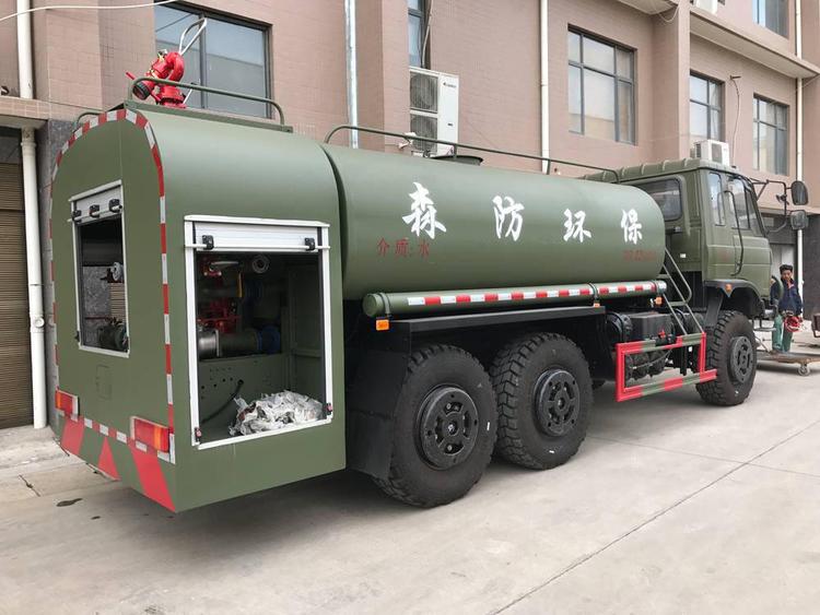 越野灑水車水罐體上裝配置:罐體采用碳鋼Q235板材,板材厚度4mm,罐體容積10-12立方,安裝全功率夾心取力器,CB10/40型消防水泵,帶PS40消防水炮一個,射程大于55米,后置工作泵箱,消防栓接口左右各一個,駕駛室頂部安裝長條警燈帶喊話器,全車顏色軍綠,兩側(cè)噴涂白色森林消防字樣。