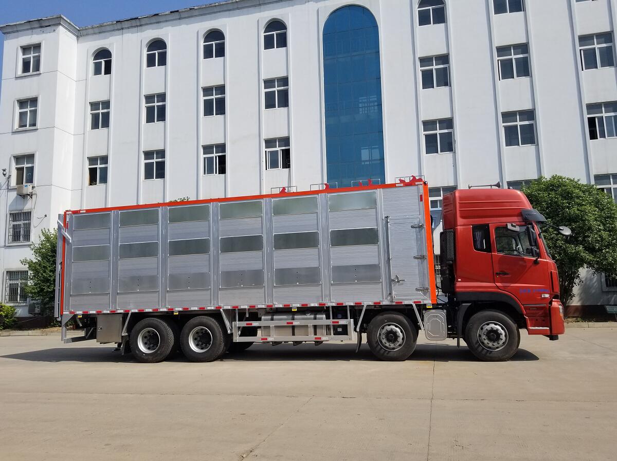 東風天龍前四后八全鋁合金運輸車,又稱鋁合金禽畜運輸車,可做三層或四層,品質(zhì)更佳,車身結構采用鋁合金打造,不銹鋼噴頭和飲水頭,相比鋼制車體,重量減輕20%-30%,可以裝載更多的畜禽,空車行駛節(jié)約燃料,低維保費用,不生銹,生命周期無線延長,無需漆面保護,清潔簡單便捷,操作簡易,車廂升降平臺由全液壓控制,遙控操作更加簡便,自動恒溫系統(tǒng),車廂設計合理方便控制家禽上下車,遙控升降車,動物福利,更大的 內(nèi)部空間,家禽在車廂內(nèi)更感舒適,溫度控制系統(tǒng),沖淋飲水系統(tǒng),遙控側面通風系統(tǒng),可開合側窗系統(tǒng),強制通風系統(tǒng)。