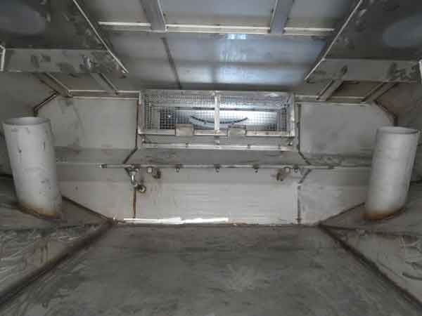 8)、污水箱內采用大平面斜坡結構,最大卸料角度可達50度,更易于傾倒垃圾。污水箱內設置了防溢滿報警裝置和高壓噴淋清洗裝置,防溢滿報警裝置可防止污水作業時從吸管溢出,造成二次污染;高壓噴淋清洗裝置在傾倒垃圾后可對污水箱進行自動清洗,大大減輕了操作人員的勞動強度