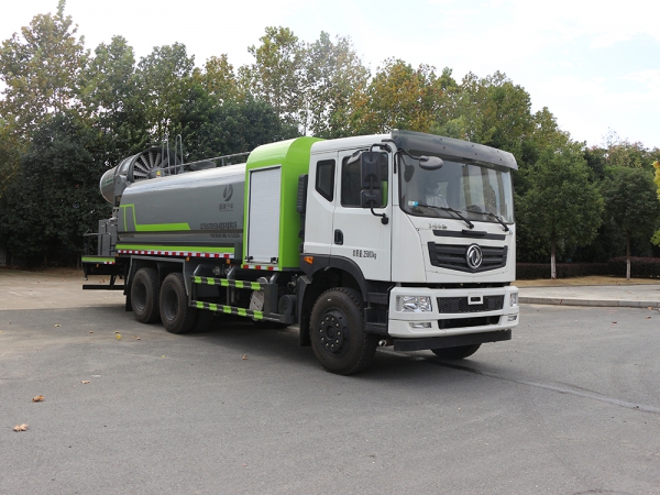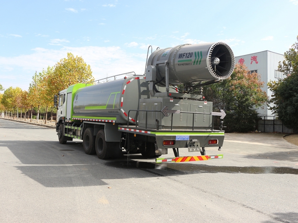 東風大型灑水車-抑塵車上裝配置: 1、罐體約為 17 方,可加裝 60-120 型霧炮 2、邊燈帶電,罐體尾部上方標配 2 個紅色示寬燈, 3、標配前噴為鴨嘴直沖,標配后沖,用戶可根據自己的需求,來調 整對沖位置。