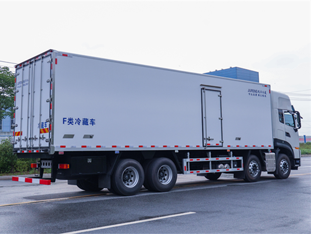 東風天龍9米6冷藏車廂體配置為:斷橋隔溫工藝,整體結構框架,內外面料為3mm新款啞光玻璃鋼夾保溫層真空復合而成,廂體厚度為8cm,最新款鋁合金包邊型材,型材局部厚度為4mm(鋼制鉚釘加固),廂體內部采用2個LED照明燈及廂體示寬燈,后門框不銹鋼材質,門框密封條為三元乙丙橡膠材質,加厚型不銹鋼合頁及鎖件;副梁為Q700車用大梁鋼,15mm厚大梁墊皮,加裝防撞膠塊,不銹鋼門鎖件,配后雙開門,副駕駛一側居中靠前開單側門一個,帶2個排水孔。