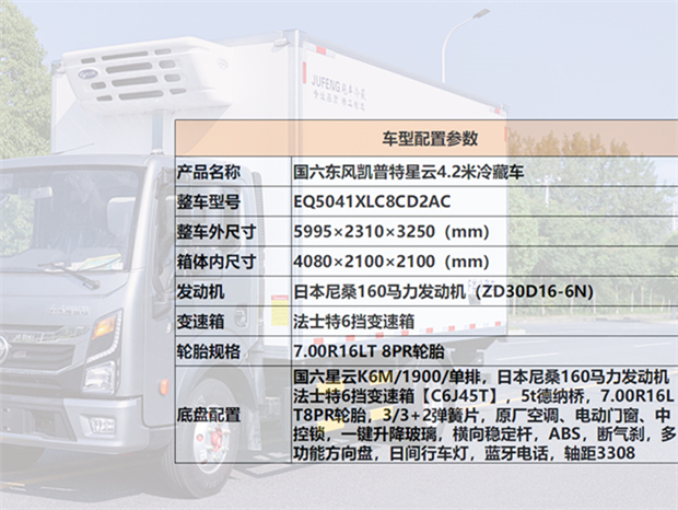 東風星云4米2冷藏車車身配置為:東風K6M1900寬單排駕駛室,東風輕型發(fā)動機,型號為:ZD30D16-6N,法士特6檔變速箱,型號為:C6J45T,5噸后橋德納橋,190mm車架,7.00R16LT 8PR輪胎,3/3+2彈簧片,原裝空調,電動窗,中控鎖,一鍵升降玻璃,橫向穩(wěn)定桿,ABS,斷氣剎,多功能方向盤,日間行車燈,藍牙電話。