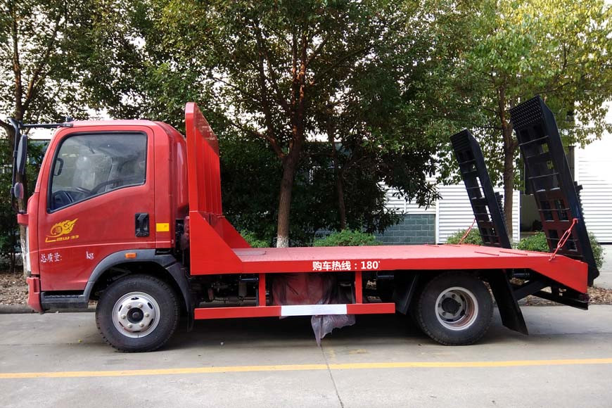 重汽豪沃平板車可上藍牌,新款駕駛室,云內130馬力,6檔變速箱,3280mm軸距,750R16鋼絲胎,6噸后橋,200mm大梁,帶ABS,方向助力,電動門窗,平板含斜坡長4米,寬2.4米。,配置豐富。