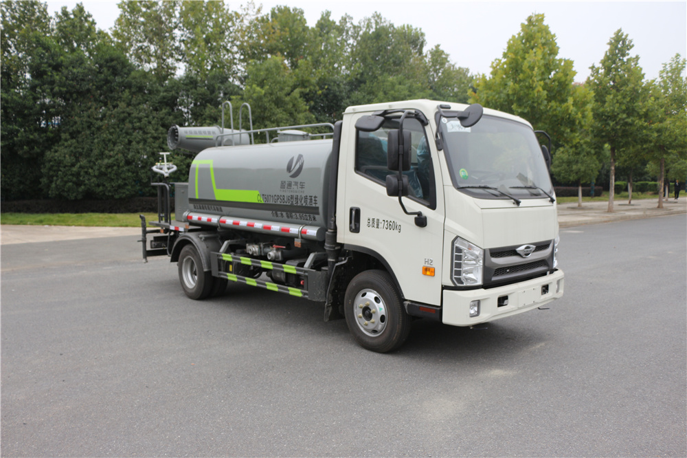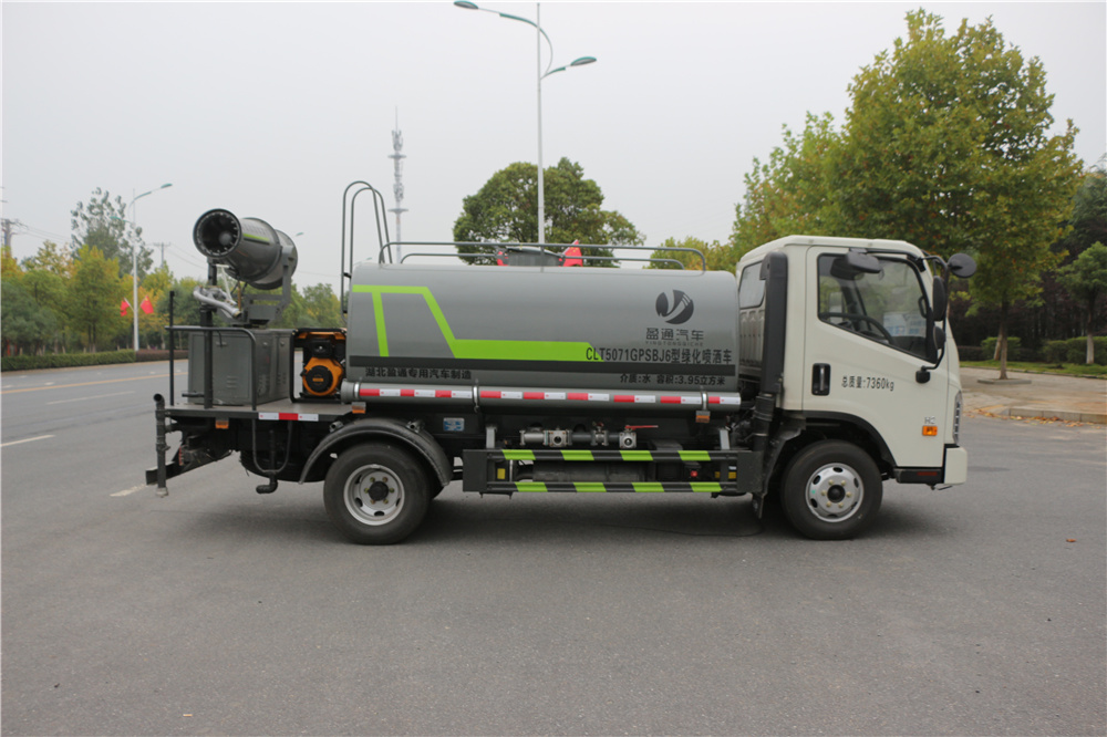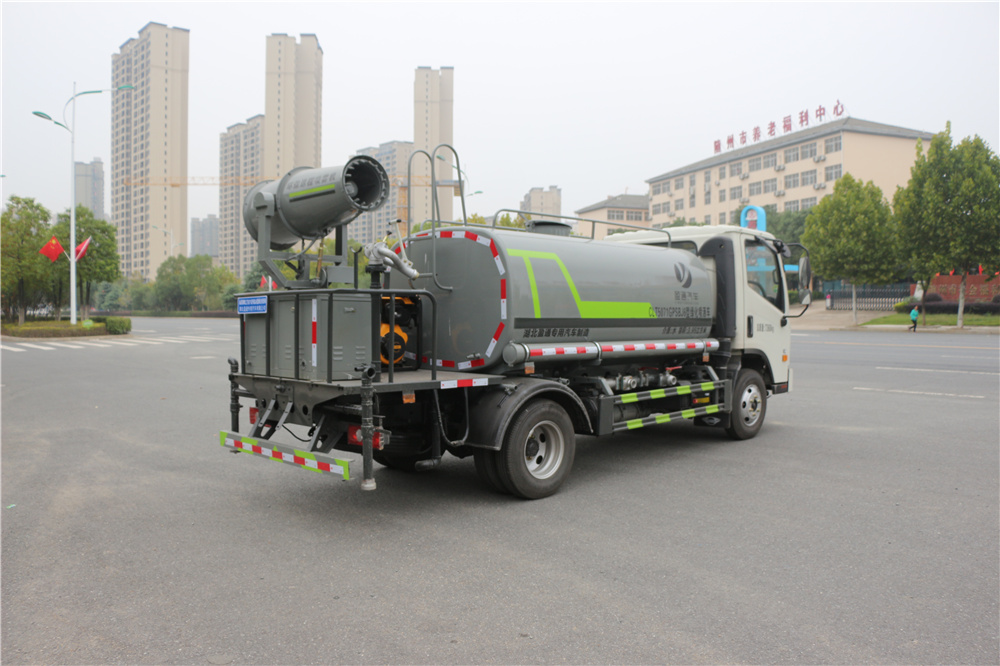 專用功能配置:罐體實際容積為5立方米,采用武鋼優質碳鋼板卷壓成型。配備專用灑水泵,自吸自排,前噴后灑、側噴、后工作平臺及灑水高壓炮。灑水泵自吸高度為6米左右,整車灑水寬度14米左右,后工作平臺水炮可調成:直沖狀、大雨、中雨、小雨、毛毛雨,有效射程≥28米,整車帶接頭、水位計,自流閥及自吸功能。后工作平臺主管道帶1寸澆花接口,附送2根3米水管,1個爬梯,兩側及后保險杠。