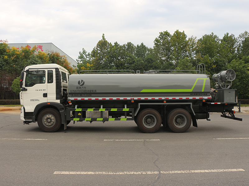 標準配置灑水車主要裝備有:前沖(沖洗公路路面)、后灑(公路路面養護)、側噴、高位側花灑(路邊綠化帶優化);后工作平臺高壓水炮,可調節成柱狀,射程≥28m;也可調節成霧狀,射程≥30米,水泵自吸高度:≤7m,灑水寬度:≥15m。側防護網,自流閥,消防接頭。灑水車水泵為常壓水泵,功能可以抽水、排水。另外根據用戶要求,可加消防泵、噴霧機、農藥卷盤、農藥柱塞泵。罐內可以做防腐防銹、電磁閥氣動閥自動放水等****,以滿足不同用戶需求。
