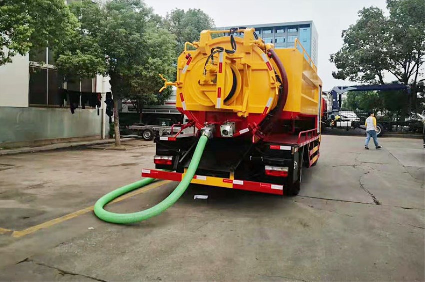 東風天錦底盤,東風康明斯ISB180 50 高壓共軌國五排放發動機,4700mm軸距,860mm等寬大梁,有燃油箱鎖,電子油門踏板及開關,消聲器側置排氣口朝向側吹,東風6檔變速箱,4.5噸前橋9 噸后橋,9. 00R20 18PR鋼絲胎,自動調整臂,東風ABS,電動門窗 ,顏色工程黃,滿足GB7258新法規上戶要求。上裝配置:罐體總容積:14方。吸污罐體尺寸:4000*1600 mm,罐體采用6mm碳鋼板,蝶形封頭8mm厚,清水罐4方,厚度:4mm,吸污罐8方,罐體舉升為斜拉頂舉升, 后蓋采用液壓開啟。吸污泵采用:2BE204循環泵,罐體頂部帶360旋轉吊桿,清洗罐頂部為普通罐口,尾部一個6寸排污球閥,氣動開啟,一個4寸進料口,右側進料口,清洗泵采用德國品孚215L流量高壓泵,壓力22兆帕,高壓管卷盤為液壓收放,安裝車輛后蓋上,配60米22#高壓管,8米吸污管2根,帶LED箭頭燈,整車顏色:工程黃。