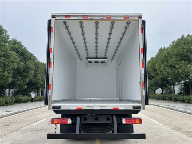 奧鈴大黃蜂6米8冷藏車廂體配置為:斷橋隔溫工藝,整體結(jié)構(gòu)框架,內(nèi)外面料為3mm新款啞光玻璃鋼夾保溫層真空復(fù)合而成,廂體厚度為8cm,最新款鋁合金包邊型材,型材局部厚度為4mm(鋼制鉚釘加固),廂體內(nèi)部采用2個(gè)LED照明燈及廂體示寬燈,后門框不銹鋼材質(zhì),門框密封條為三元乙丙橡膠材質(zhì),加厚型不銹鋼合頁及鎖件;副梁為Q700車用大梁鋼,15mm厚大梁墊皮,加裝防撞膠塊,不銹鋼門鎖件,配后雙開門,副駕駛一側(cè)居中靠前開單側(cè)門一個(gè),帶2個(gè)排水孔。